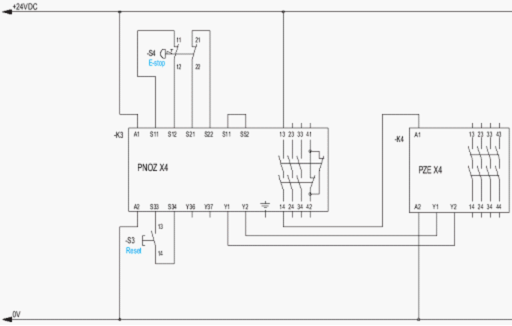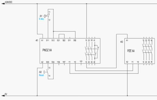 我們可以把一個簡單的控制電路分成信號輸入部分(如急停按鈕、限位開關、光柵)、控制部分(如繼電器、PLC)和輸出部分(如控制電機用交流接觸器)。根據EN 954-1中安全等級的描述,若要達到安全等級2級及其以上,控制部分必須使用安全的元器件,如安全繼電器、安全PLC等。在所使用的安全繼電器達到要求的安全等級的基礎上,我們通常可以通過信號輸入部分的接線來判斷等級234。我們現在以急停按鈕為例,分析這三個安全等級的應用接線。