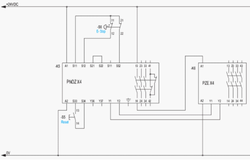 若使用雙通道信號輸入,進入安全繼電器,同時可檢測兩個輸入觸點間的短路。那么這個控制回路的安全等級是在4級,如圖6所示。